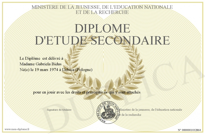 Envoyez par email votre DIPLOME D'ETUDE SECONDAIRE personalisé
