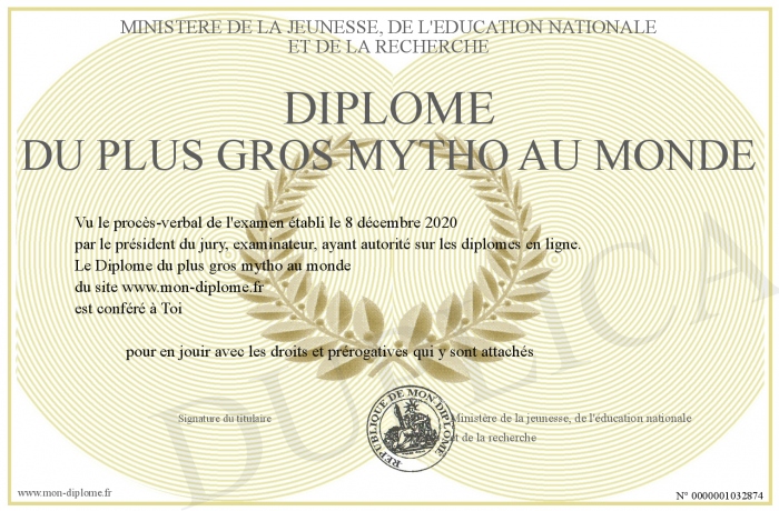 Envoyez par email votre Diplôme du plus gros mytho au monde personalisé
