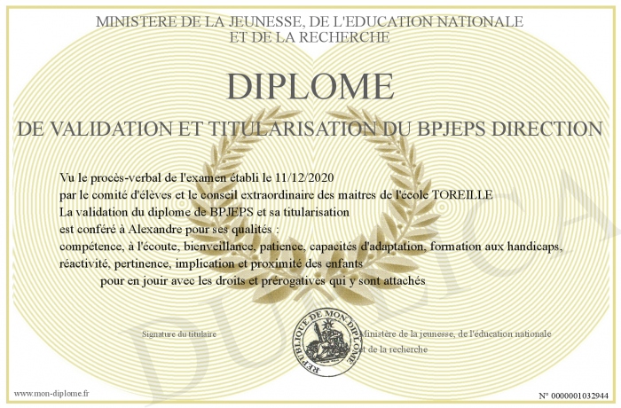 Envoyez par email votre Diplôme de Validation et Titularisation du BPJEPS direction personalisé
