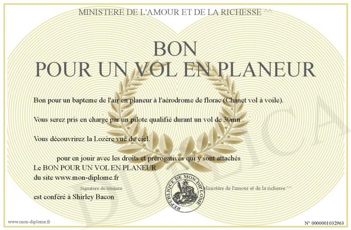 Envoyez par email votre BON POUR UN VOL EN PLANEUR personalisé
