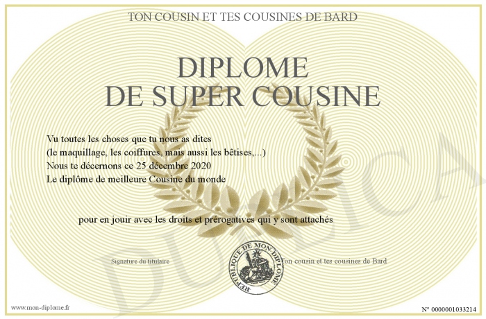 Envoyez par email votre Diplôme de super Cousine personalisé