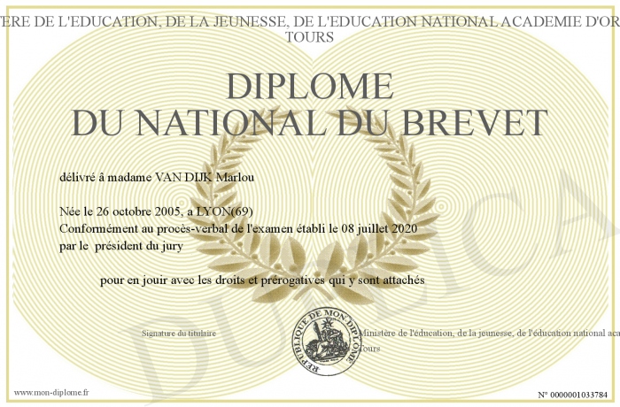 Envoyez par email votre Diplôme du national du brevet personalisé