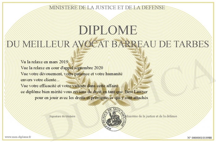 Envoyez par email votre Diplôme du meilleur Avocat barreau de Tarbes personalisé