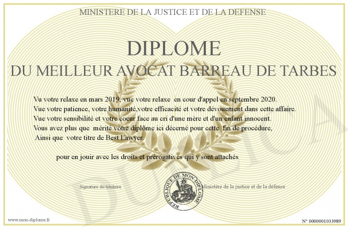Envoyez par email votre Diplôme du meilleur avocat barreau de Tarbes personalisé