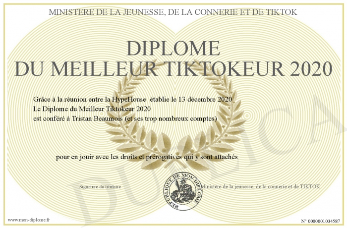 Envoyez par email votre Diplôme du Meilleur Tiktokeur 2020 personalisé