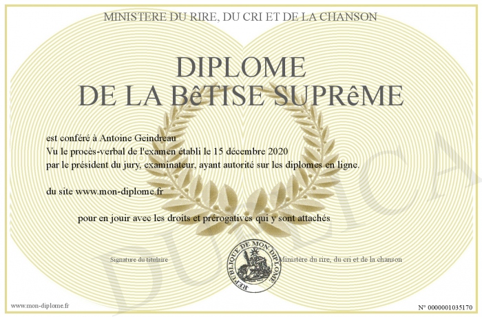 Envoyez par email votre Diplôme de la bêtise suprême personalisé