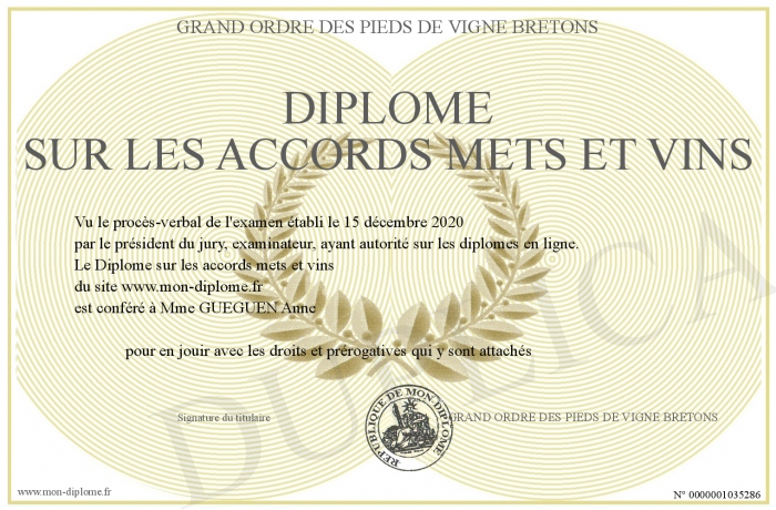 Envoyez par email votre Diplôme sur les accords mets et vins personalisé