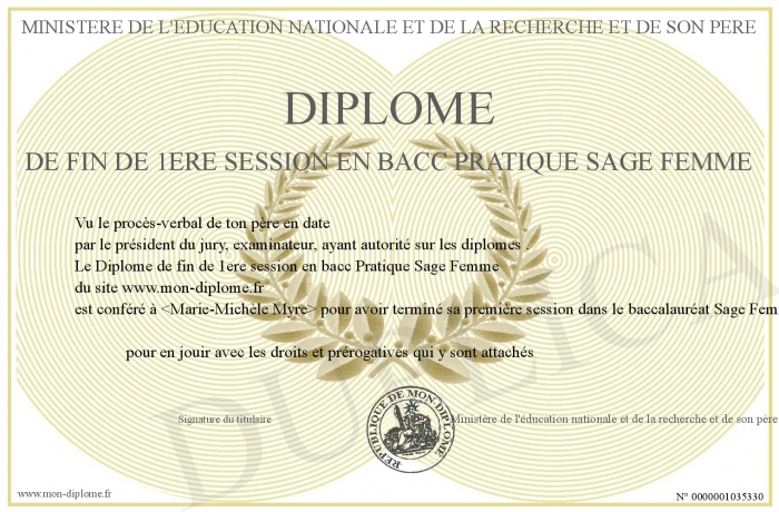 Envoyez par email votre Diplôme de fin de 1ere session en bacc Pratique Sage Femme personalisé