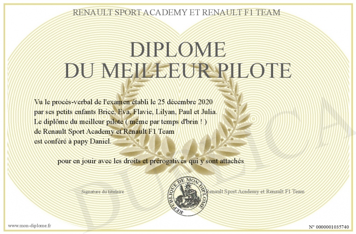 Envoyez par email votre Diplôme du meilleur pilote personalisé