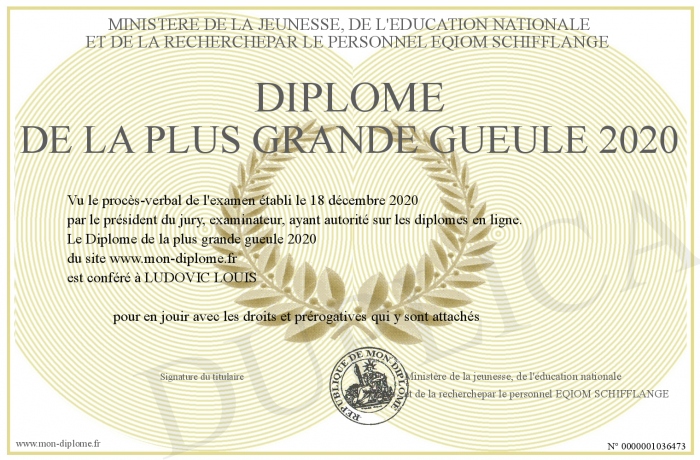Envoyez par email votre Diplôme de la plus grande gueule 2020 personalisé