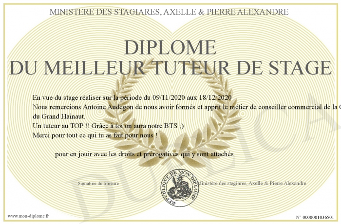 Envoyez par email votre Diplôme du meilleur tuteur de stage personalisé