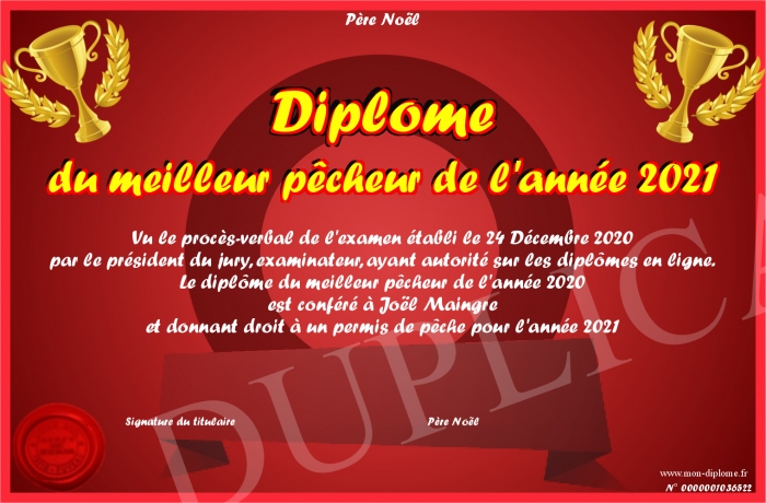 Envoyez par email votre Diplôme du meilleur pêcheur de l'année 2021 personalisé