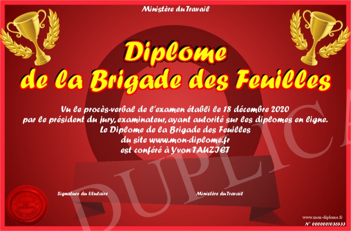 Envoyez par email votre Diplôme de la Brigade des Feuilles personalisé