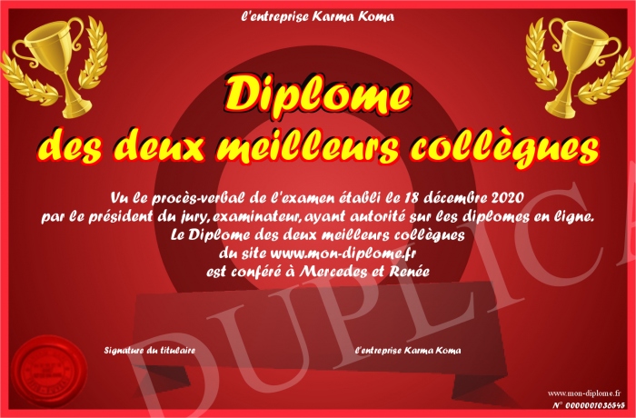 Envoyez par email votre Diplôme des deux meilleurs collègues personalisé