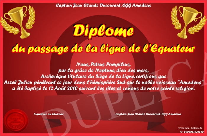 Envoyez par email votre Diplôme du passage de la ligne de l'Equateur personalisé