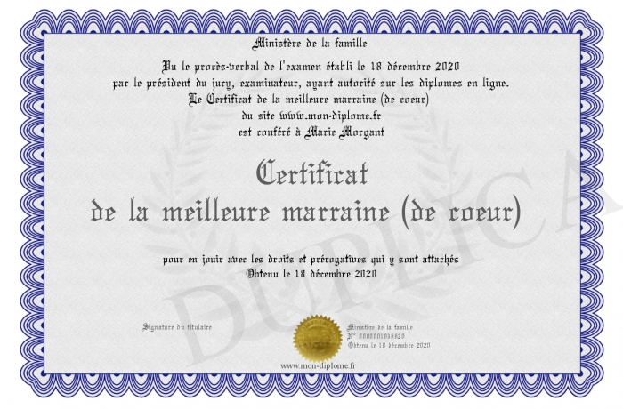 Envoyez par email votre Certificat de la meilleure marraine (de coeur) personalisé