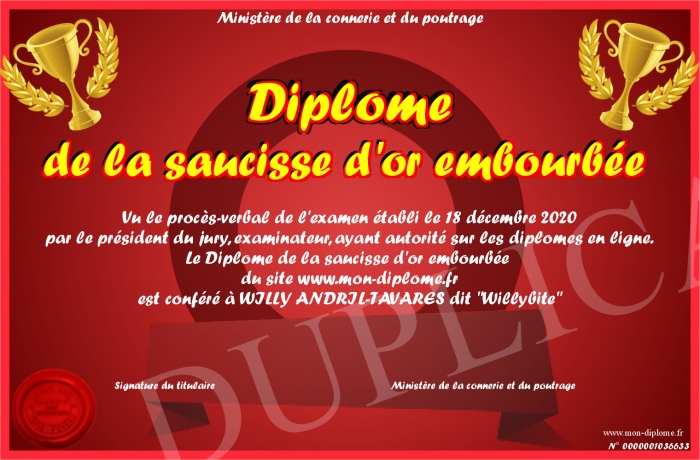Envoyez par email votre Diplôme de la saucisse d'or embourbée personalisé