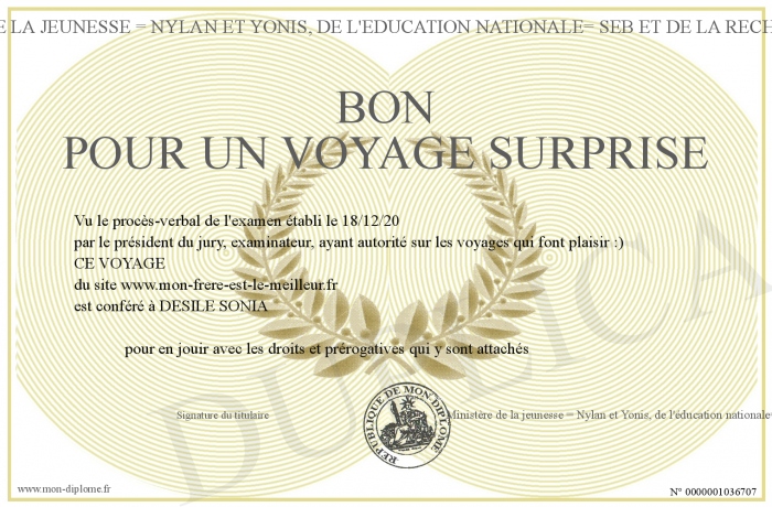 Envoyez par email votre BON POUR UN VOYAGE SURPRISE personalisé