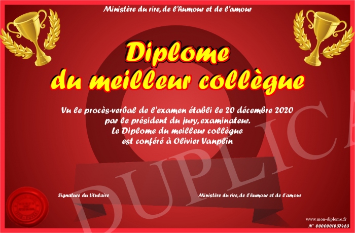 Envoyez par email votre Diplome du meilleur collègue personalisé