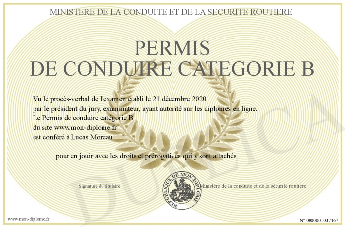 Envoyez par email votre Permis de conduire catégorie B personalisé