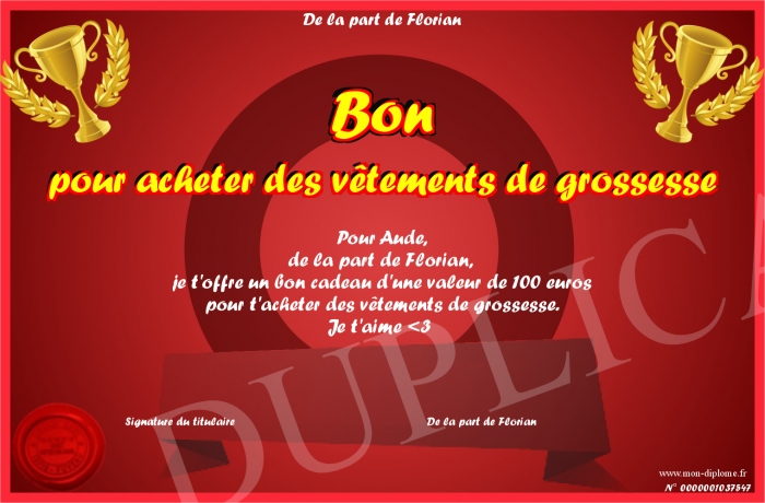 Envoyez par email votre Bon pour acheter des vêtements de grossesse personalisé
