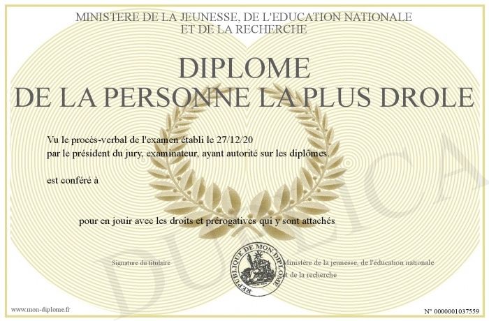 Envoyez par email votre Diplôme de la personne la plus drôle personalisé