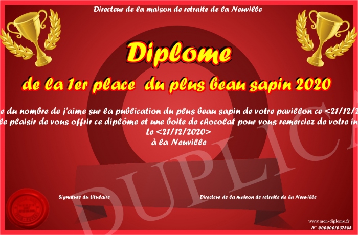 Envoyez par email votre Diplôme de la 1er place du plus beau sapin 2020 personalisé