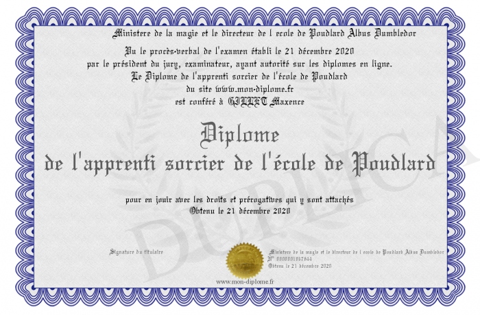 Envoyez par email votre Diplôme de l'apprenti sorcier de l'école de Poudlard personalisé
