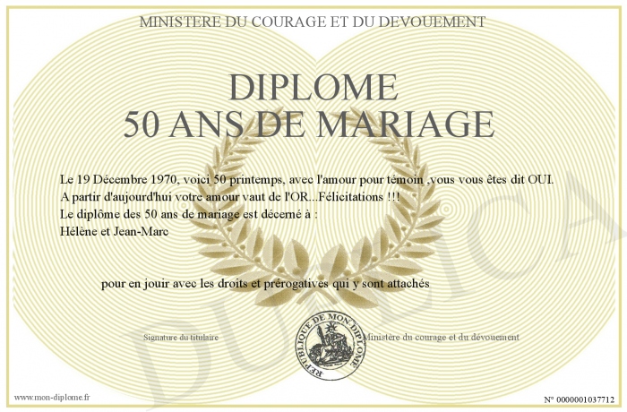 Envoyez par email votre Diplôme 50 ANS DE MARIAGE personalisé