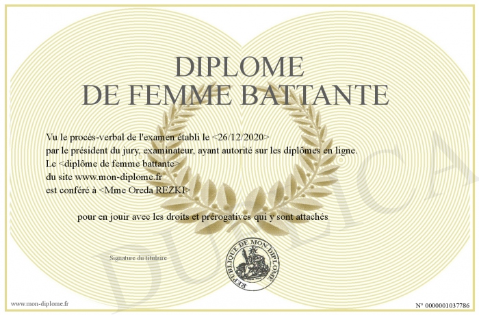 Envoyez par email votre Diplôme de femme battante personalisé
