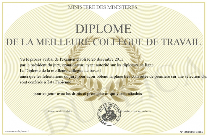 Envoyez par email votre Diplôme de la meilleure collègue de travail personalisé