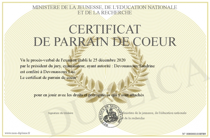Envoyez par email votre Certificat de parrain de coeur personalisé