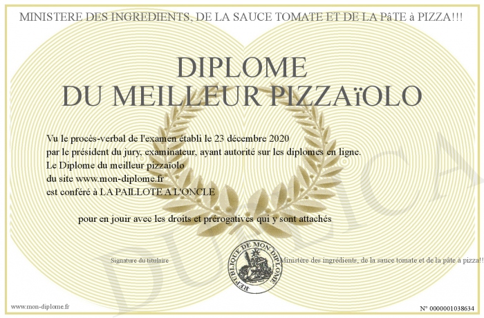 Envoyez par email votre Diplôme du meilleur pizzaïolo personalisé