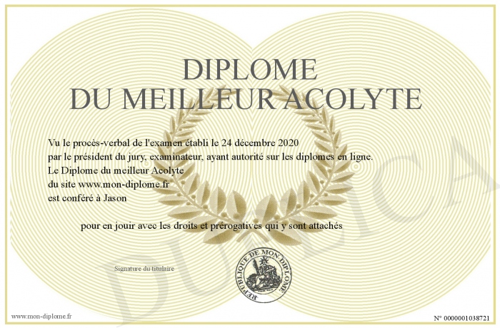 Envoyez par email votre Diplôme du meilleur Acolyte personalisé