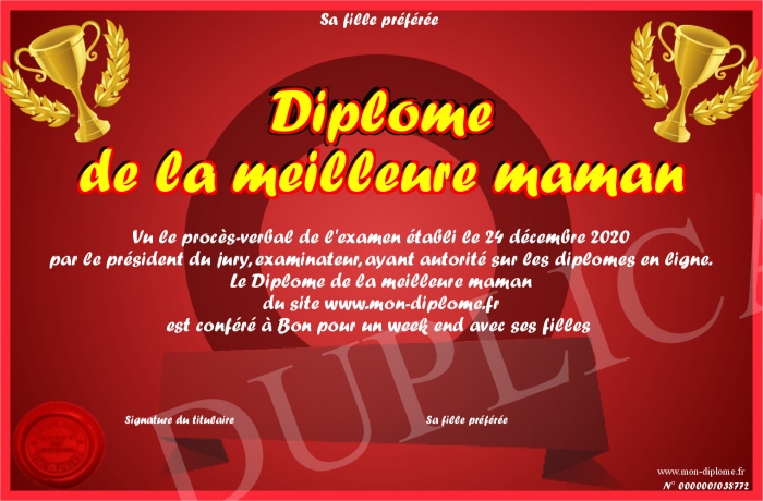 Envoyez par email votre Diplôme de la meilleure maman personalisé