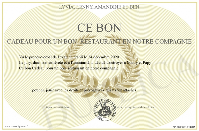 Envoyez par email votre Ce bon Cadeau pour un bon restaurant en notre compagnie personalisé
