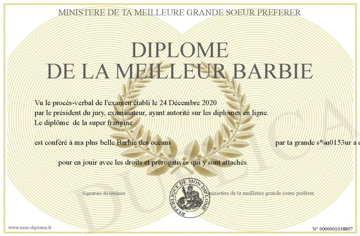 Envoyez par email votre Diplôme de la meilleur barbie personalisé