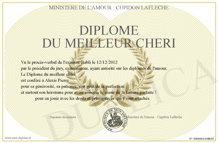 Envoyez par email votre Diplôme du meilleur chéri personalisé