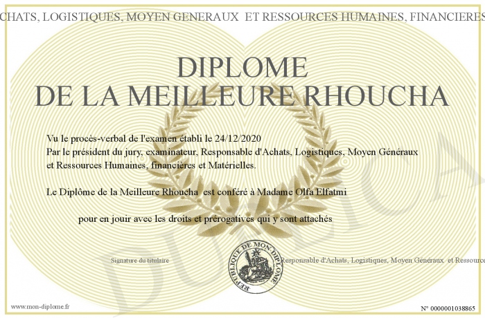Envoyez par email votre Diplôme de la Meilleure Rhoucha personalisé
