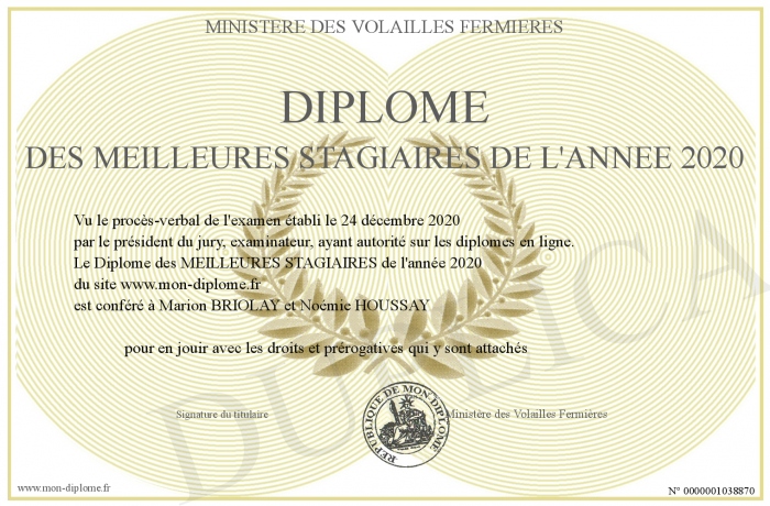 Envoyez par email votre Diplôme des MEILLEURES STAGIAIRES de l'année 2020 personalisé