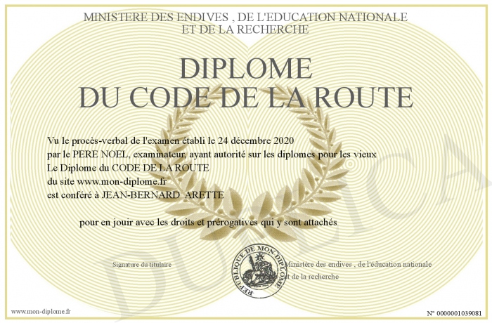 Envoyez par email votre Diplôme du CODE DE LA ROUTE personalisé