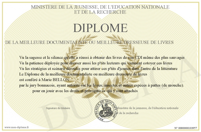 Envoyez par email votre Diplôme de la meilleure documentaliste ou meilleure dresseuse de livres personalisé