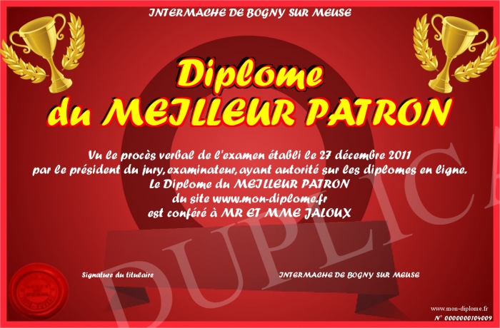 Envoyez par email votre Diplôme du MEILLEUR PATRON personalisé