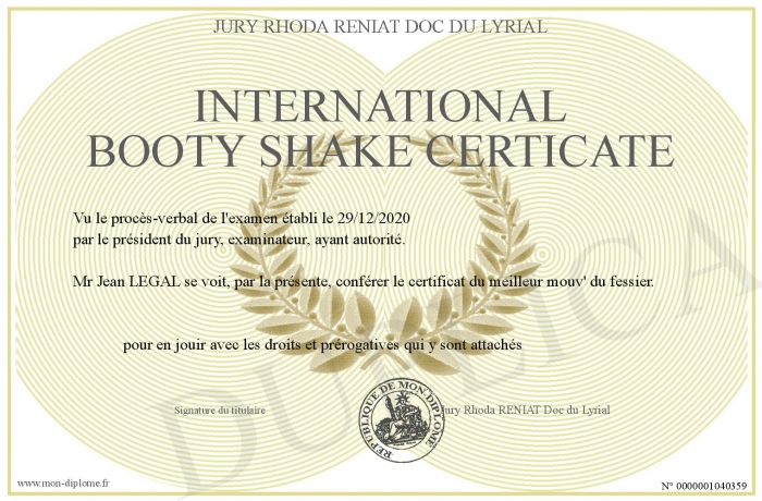 Envoyez par email votre INTERNATIONAL BOOTY SHAKE CERTICATE personalisé