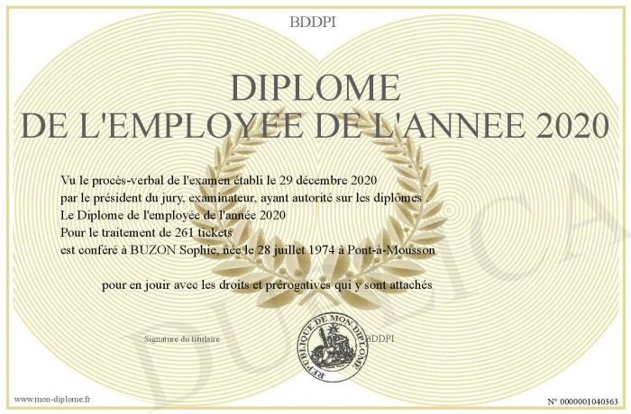 Envoyez par email votre Diplome de l'employée de l'année 2020 personalisé