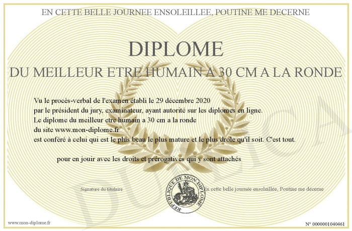 Envoyez par email votre diplôme du meilleur etre humain a 30 cm a la ronde personalisé