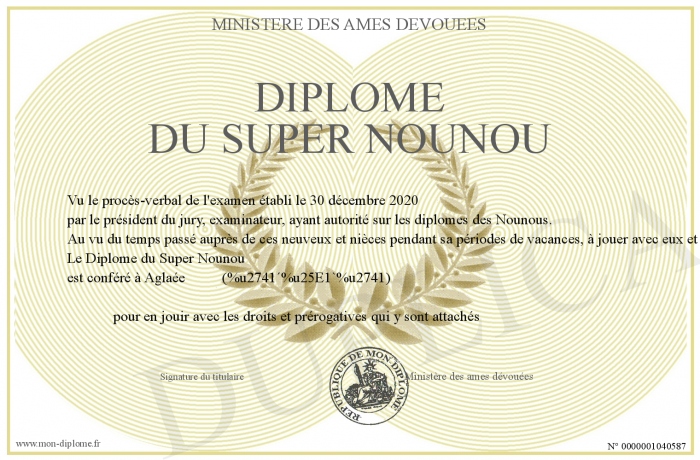 Envoyez par email votre Diplôme du Super Nounou personalisé