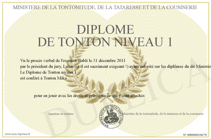 Envoyez par email votre Diplôme de Tonton niveau 1 personalisé