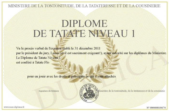 Envoyez par email votre Diplôme de Tatate Niveau 1 personalisé