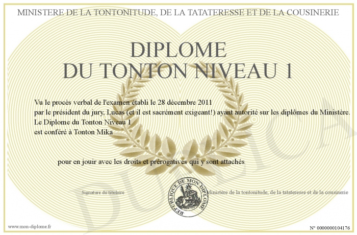 Envoyez par email votre Diplôme du Tonton Niveau 1 personalisé